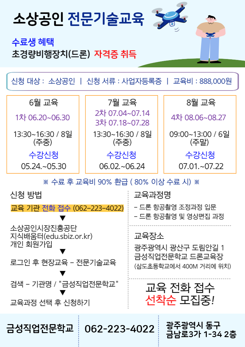 금성직업전문학교에서는 소상공인을 대상으로 하는 전문기술교육을 6월~8월까지 진행할 예정입니다.