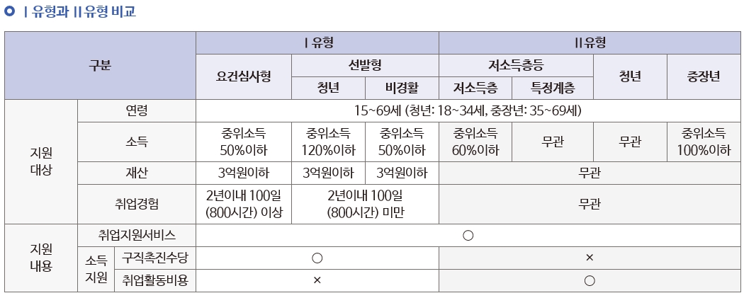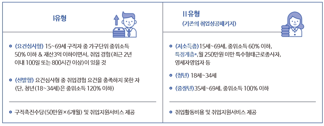 * Ⅰ유형은 '구직촉진수당'과 '취업지원서비스'를 함께 지원합니다. * Ⅱ유형은 '취업활동비용과 취업지원서비스'를 제공합니다. 2. 지원내용 - Ⅰ 유형과 Ⅱ유형 참여자 모두에게 취업지원서비스를 제공합니다. - Ⅰ유형 참여자에게는 최소한의 생활안정을 위하여 최대 300만원 (월50만원x6개월)의 구직촉진수당도 지급합니다. - Ⅱ유형 참여자는 직업훈련 참여 등 구직활동을 할 때 발생하는 비용의 일부를 취업활동비용으로 지원합니다.