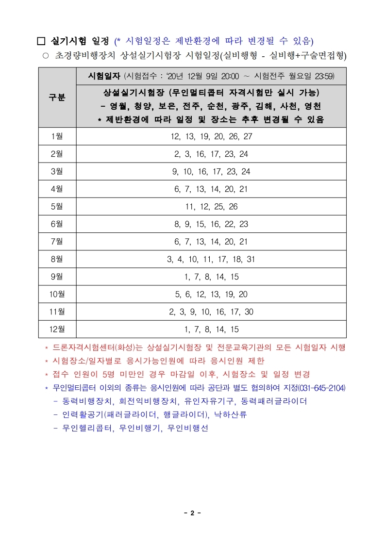 2021년도 초경량비행장치 조종자증명 시험일정(학과시험, 실기)