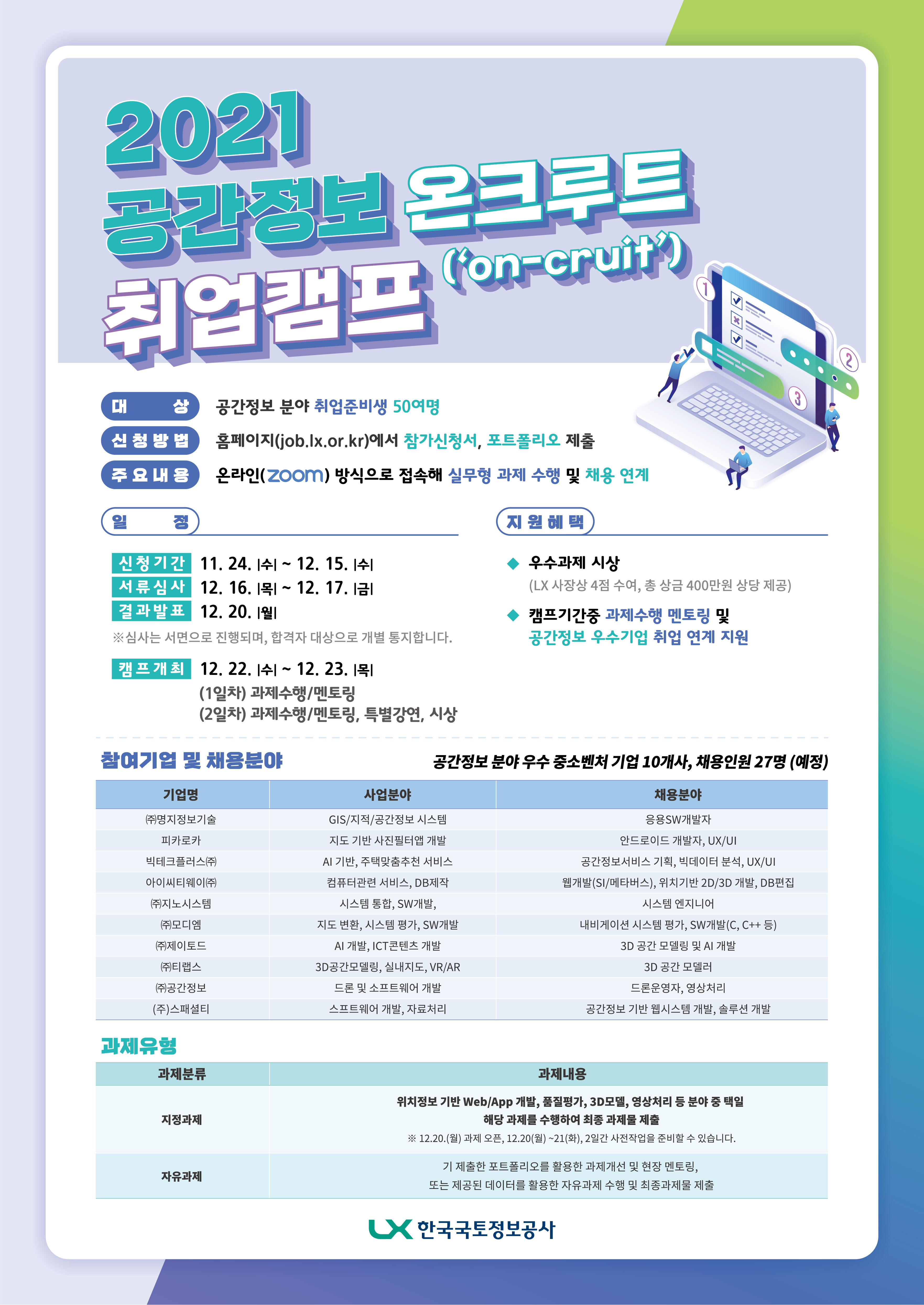 1. 서류 전형 일정 - (서류접수) 11. 24.(수) ~ 12. 15.(수) * 접수처: https://job.lx.or.kr - (서류심사) 12. 16.(목) ~ 12. 17.(금) - (결과발표) 12. 20.(월) * 합격자 개별통보 예정 2. 채용업체 : (주)공간정보 3. 채용분야 : 드론운영자 4. 채용인원 : 1명 5. 급여조건 : 2,000만원 ~ 3,000만원 6 . 경력 : 무관 7. 우대사항 : 초경량비행장치 조종자, 컴퓨터활용능력자 8. 근무지 : 광주광역시 9. 접수방법 LX 일자리매칭플랫폼(https://job.lx.or.kr)에서 개인회원 가입 후 이력서를 작성하여 제출 - 해당 기업의 채용공고를 클릭한 후, 우측상단에 생성된 "즉시지원"