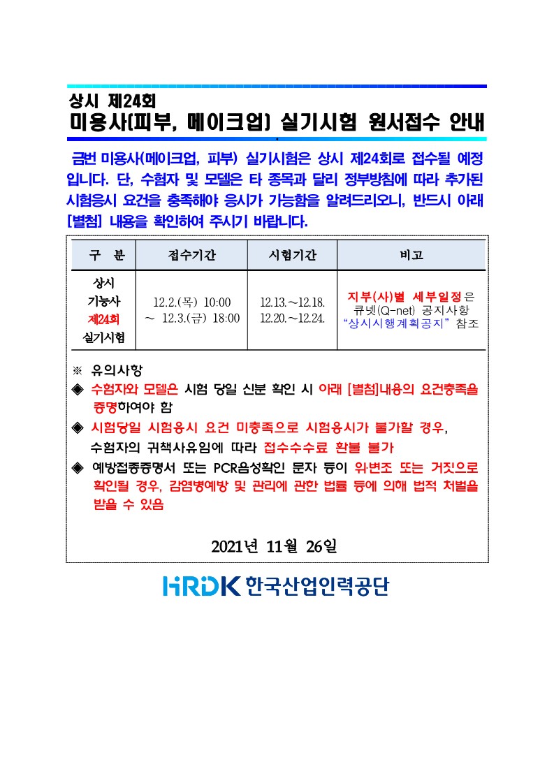 상시 제24회 미용사(피부,메이크업) 실기시험 원서접수 안내